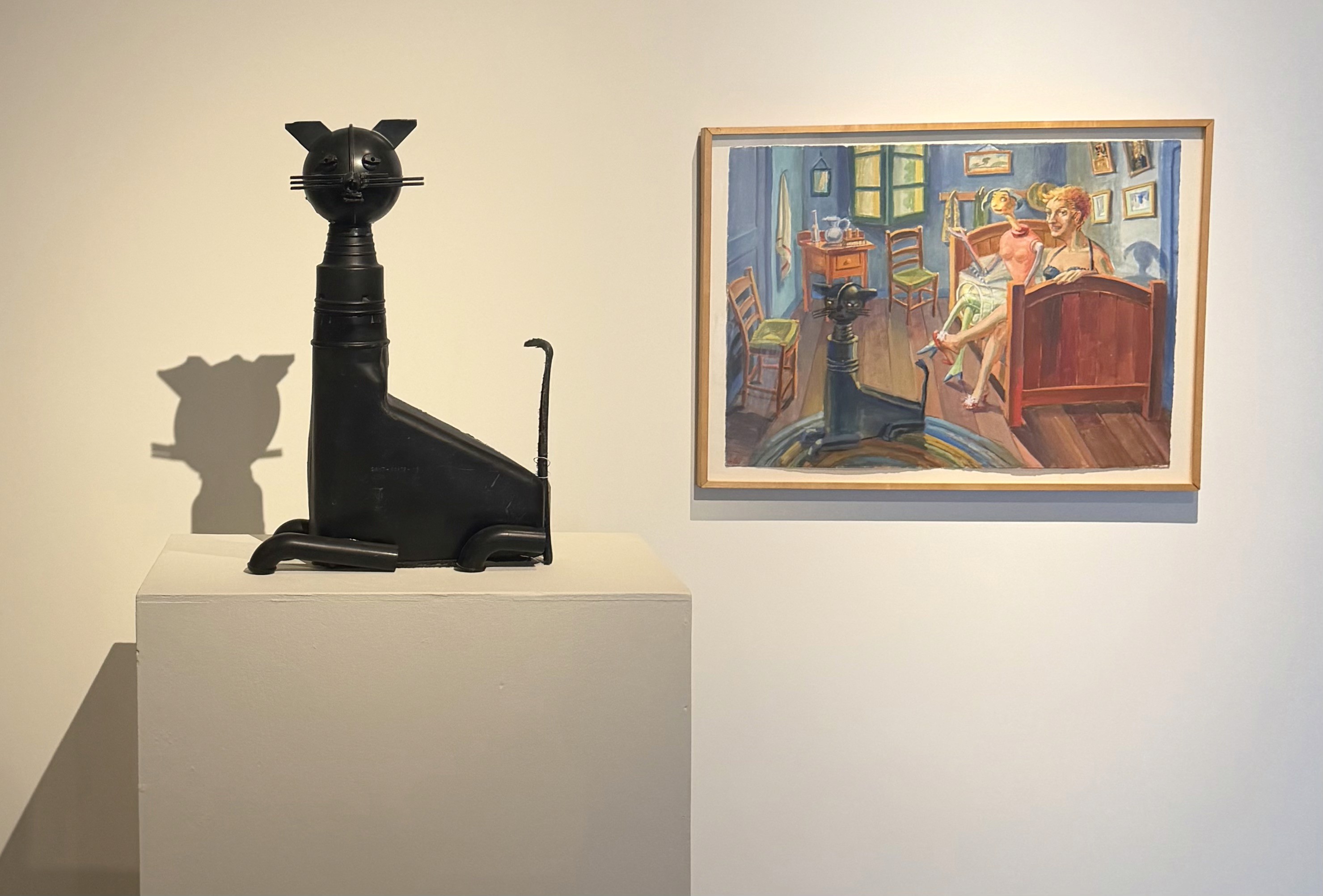 Jerry Ross Barrish, Lady Cat, 2005, assemblage found materials, 26 x 19 x 7 in; M. Louise Stanley, Waiting for Van Gogh, 2011, Acrylic on paper, 29.5 x 22 in